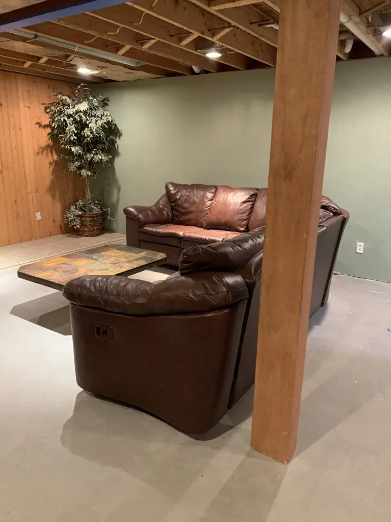 This basement started as an unfinished space with only the stairs in place. We completed the framing, drywall, painting, trim work, and tile flooring. Tongue-and-groove wall panels were installed and stained for a finished look.