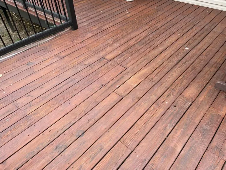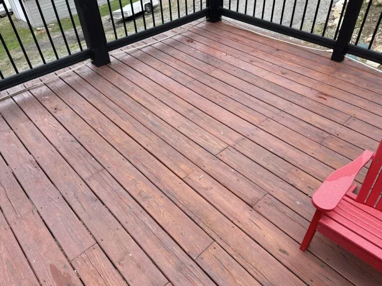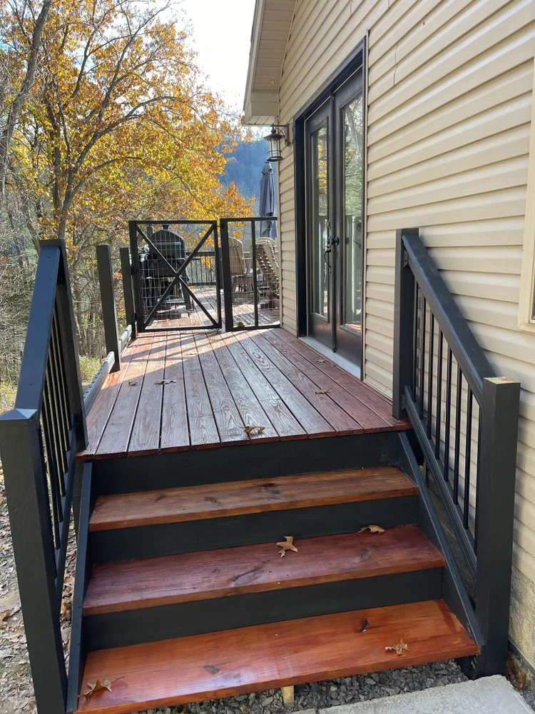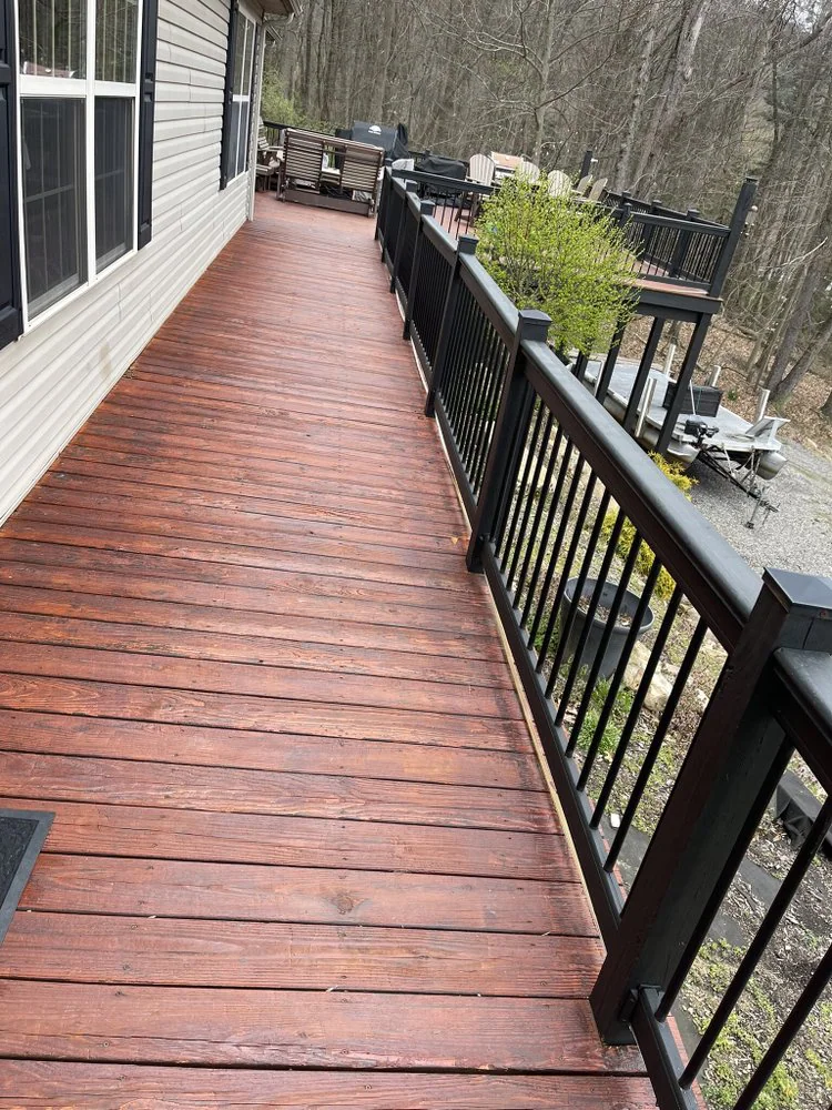 Pressure washed deck, replaced damaged boards, stained the railing in a solid color slate and the deck surface in a transparent stain